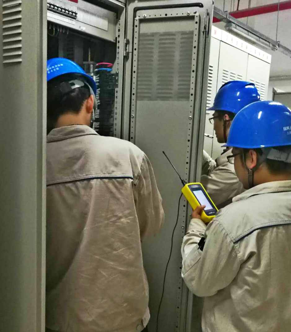 ? ? ? ? 智能變電站電壓由級聯(lián)電壓傳輸至各個間隔,需要定期進行異地相位檢修。某電力公司運維檢修部以往做二次負荷相位檢查時使用兩塊相位儀數(shù)顯表,需要將一塊表放置在PT間隔,通過試驗線連接至另一側線路間隔或者主變間隔(電壓為基準電壓),每次更換間隔檢查時都需要移動試驗線,操作不便同時也會影響結果的準確性。如果是GIS類型的智能變電站處于不同樓層,進行負荷相位檢查時,操作更加繁瑣。通過使用我公司的YD-300B 無線遙測六角圖伏安相位儀,將一臺設備放置在PT間隔采集電壓數(shù)據(jù),另一臺放置在檢查間隔,通過無線傳輸,可快速準確檢查相位的正確性、電流的朝向、差動極性等,并生成對應的測量報告。