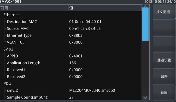 SMV控制塊是描述IED將模擬量往外發(fā)送的能力,將需要發(fā)送的模擬量實(shí)例化為不同的LN,將其匯總至發(fā)送數(shù)據(jù),數(shù)據(jù)集再關(guān)聯(lián)至Smvcb。 在NSA-60 設(shè)備端口進(jìn)入“SMV接收”界面,點(diǎn)擊“偵測(cè)”按鈕,首先偵測(cè)各光口是否接入光纖,未接入光纖的光口將給出提示,接下來(lái)進(jìn)行偵測(cè),將偵測(cè)結(jié)果顯示在界面,點(diǎn)擊任意一個(gè)APPID的SMV,即可查看有效值。