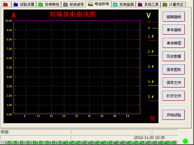 組端曲線 : 顯示蓄電池組組端電壓、放電電流隨時間的變化曲線。 組端電流曲線顏色和坐標系左側字母A顏色相同,組端電壓曲線顏色和坐標系右側字母V顏色相同。 X軸表示時間,左側y坐標表示放電電流,右側y坐標表示蓄電池組端電壓。