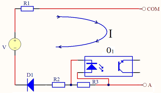 此電路的工作原理: O1最小導(dǎo)通電流為Imin,最大工作電流為Imax,回路電流為I,當(dāng)I≥Imin,時,O1導(dǎo)通,I<Imin時,O1不通,當(dāng)I>Imax時,電路燒壞。 下面我們以不帶電位接點(diǎn)(圖 2)和帶電位接點(diǎn)(圖3)兩種情況進(jìn)行說明。