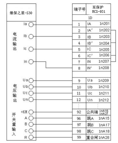 將繼保之星-S60的開入接點“A”、“B”、“C”、“R”分別與保護(hù)裝置的分相跳閘出口接點“跳A”、“跳 B”、“跳 C”以及“重合閘”接點相連,將繼保之星-S60的“+KM”與保護(hù)裝置的公共端相連。 此處線路對應(yīng)的開關(guān)位置在“合位”不考慮開出接線。