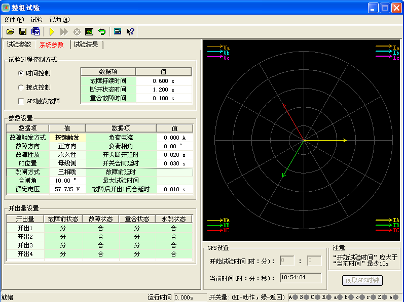 在“整組試驗”菜單里,試驗過程由保護(hù)的接點動作情況控制,此次試驗包括以下幾