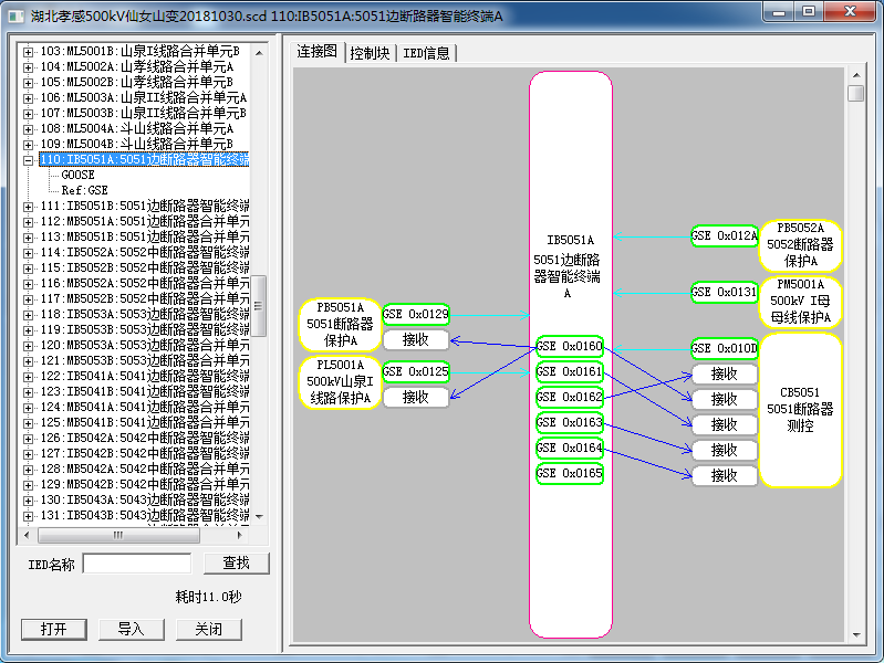 圖中右側為智能終端裝置信息圖,點擊IED對應序號疊加符號。 “GOOSE”表示該IED發(fā)送的GOOSE信息,點擊右側列表顯示對應信息; “Ref: GSE”表示該IED接收的GOOSE信息,點擊右側列表顯示對應信息。 此處需配置“Ref: GSE”。