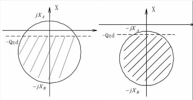 發(fā)電機定子側阻抗判據(jù)有兩種阻抗圓,異步阻抗圓或靜穩(wěn)邊界圓,動作方程為: ?