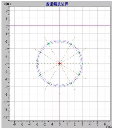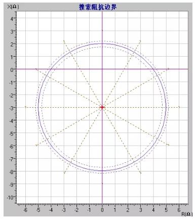 搜索中心: 根據(jù)定值可推算出中心為5Ω((8Ω+2Ω)/2=5Ω),角度為∠-90°,設置Z-Φ,軟件自動換算出R-X。