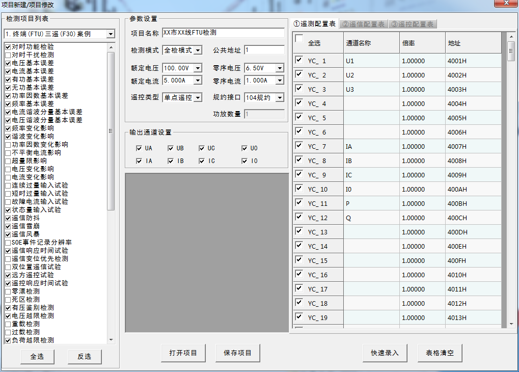 (2)自定義項(xiàng)目名稱,根據(jù)需要選擇全檢或抽檢,公共地址為終端設(shè)置的地址(從FTU/DTU廠家獲?。?。 輸入被測FTU/DTU基本參數(shù)、額定電壓、額定電流、零序電壓和零序電流等。 根據(jù)FTU/DTU信息選擇對應(yīng)的遙控類型(單點(diǎn)或雙點(diǎn))和通信規(guī)約(IEC101或104)。