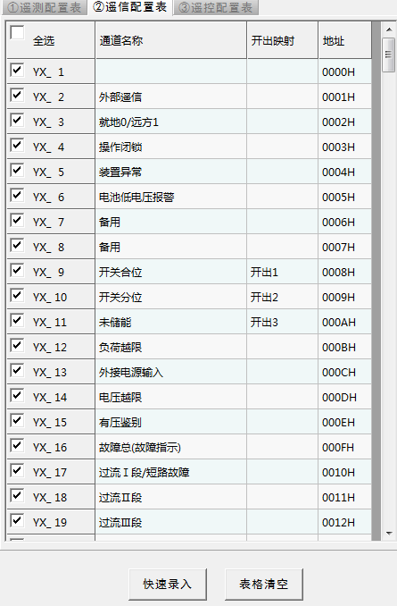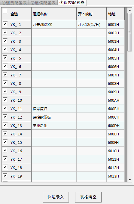 (5)遙控配置表: 根據(jù)主站提供點(diǎn)表將遙控描述填入通道名稱內(nèi),也可將主站提供的遙控點(diǎn)表復(fù)制,點(diǎn)擊快速錄入粘貼到表格,然后進(jìn)行開入映射,在開關(guān)或斷路器映射“開入1 2(合/分)”。