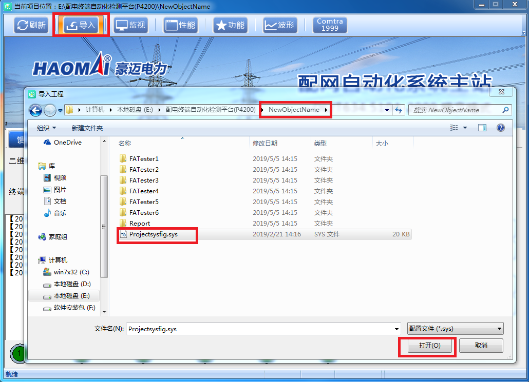 按要求完成參數(shù)設(shè)置,點(diǎn)擊“保存項(xiàng)目”并退出。 打開“配網(wǎng)測試”,點(diǎn)擊“導(dǎo)入”,打開項(xiàng)目管理保存的工程項(xiàng)目名稱,選擇“Projectsysfig.sys”,點(diǎn)擊打開。