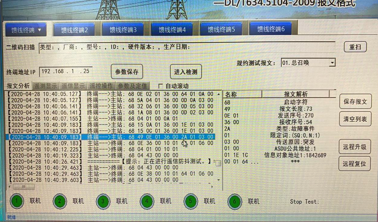 用掃碼槍掃入裝置型號編碼等(也可手動輸入),在終端地址IP欄輸入對應(yīng)測試終端IP,點(diǎn)擊參數(shù)保存并刷新,等待10s左右,下側(cè)對話框出現(xiàn)報(bào)文,則表示自動連接成功,確認(rèn)報(bào)文無異常后點(diǎn)擊“進(jìn)入檢測”即可進(jìn)行一鍵式自動化測試。