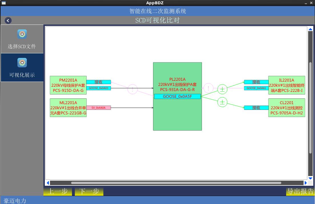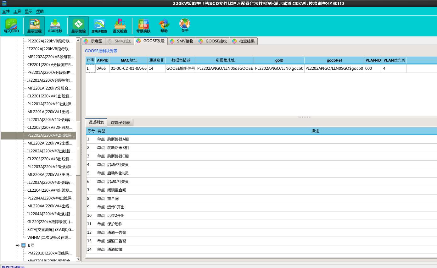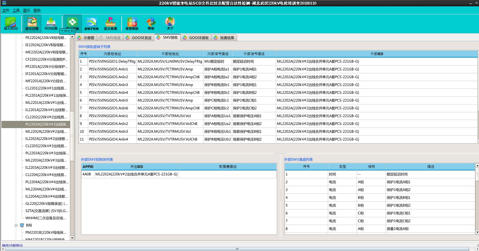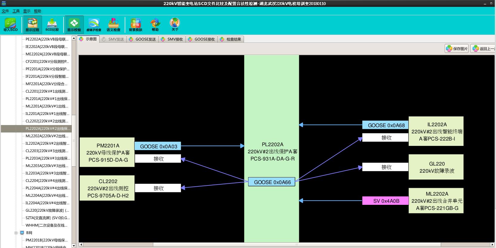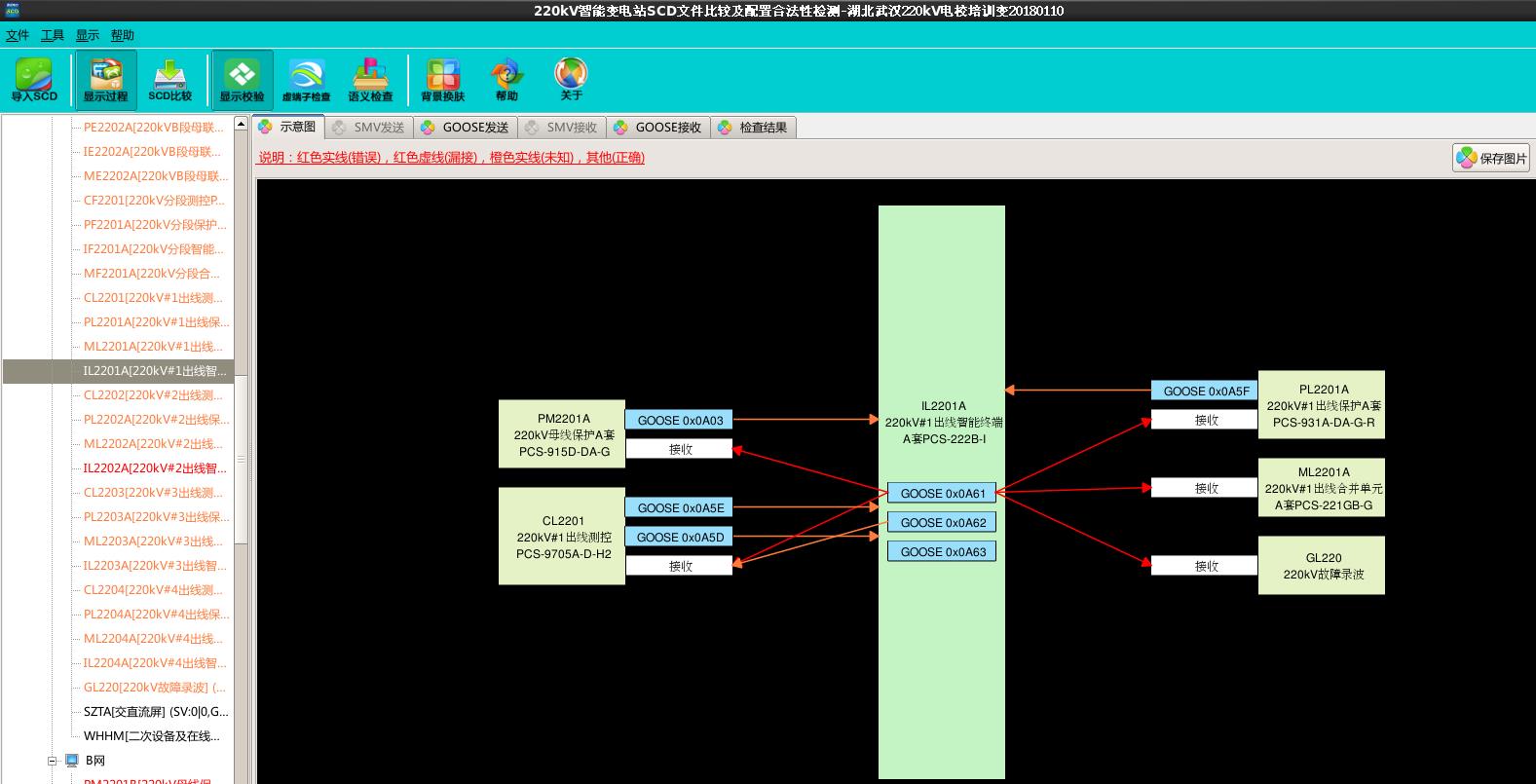 該模塊基于快速的XML超大文件解析和基于圖論的關(guān)聯(lián)搜索的軟件算法對(duì)智能變電站SCD文件進(jìn)行智能解析,結(jié)合220kV虛端子自查原則,利用模糊匹配原則,不僅可以方便快速實(shí)現(xiàn)對(duì)全站配置SCD文件虛端子合法性檢查,還可以可視化展示模型文件中各IED之間網(wǎng)絡(luò)連接、自動(dòng)生成IED之間虛擬二次回路的邏輯連接圖。