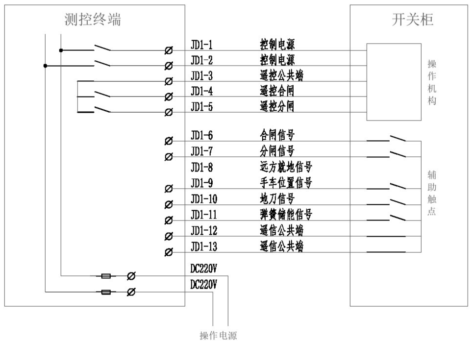 現(xiàn)場(chǎng)利用原開關(guān)柜(環(huán)網(wǎng)柜)的二次原理圖分別找到遙控和遙信接點(diǎn)(如果沒有預(yù)留接點(diǎn)現(xiàn)場(chǎng)加繼電器擴(kuò)展),通過敷設(shè)的二次控制電纜將開關(guān)柜(環(huán)網(wǎng)柜)的遙控和遙信接點(diǎn)接入DTU測(cè)控終端回路中,實(shí)現(xiàn)遙控、遙信功能。