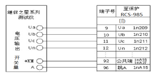 將繼保之星-S60 手持式繼電保護測試系統的輸出電壓UA、UB、UC、 UN接入發(fā)電機保護裝 置的機端電壓端子排,將過激磁保護的跳閘動作接點接入繼保之星-S60 的開入量A和公共端。