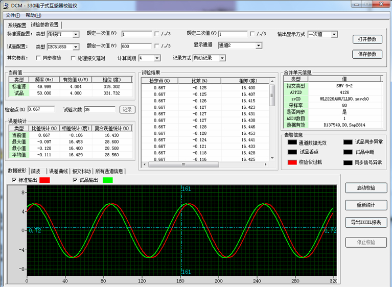 DCM-330 電子式互感器校驗儀信號處理程序采用高精度算法和頻率跟蹤處理,對各種規(guī)范的解碼具有通用性,能夠根據(jù)被校通道數(shù)據(jù),進行數(shù)據(jù)分析,通過綜合處理得到被校設(shè)備的比差、角差、頻率等指標(biāo),同時完成波形繪制,并將指標(biāo)保存為表格。
