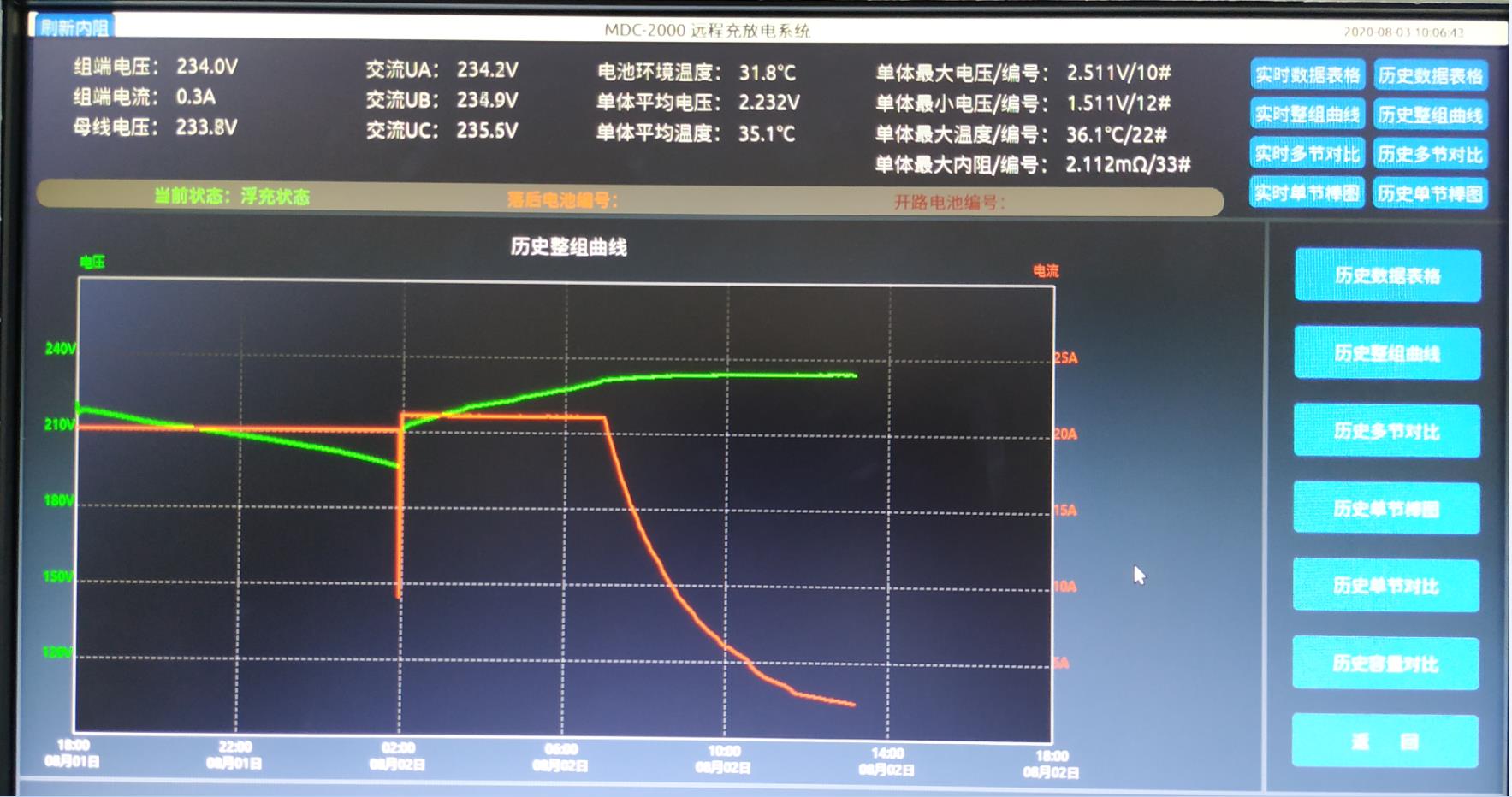 通過MDC-2000 變電站蓄電池綜合監(jiān)測及遠程自動維護系統(tǒng)遠程核容及在線監(jiān)測,在主站遠程操作蓄電池充放電試驗,查看蓄電池的各項實時數(shù)據(jù)和歷史數(shù)據(jù)。