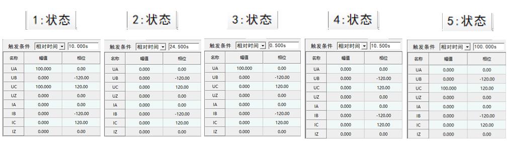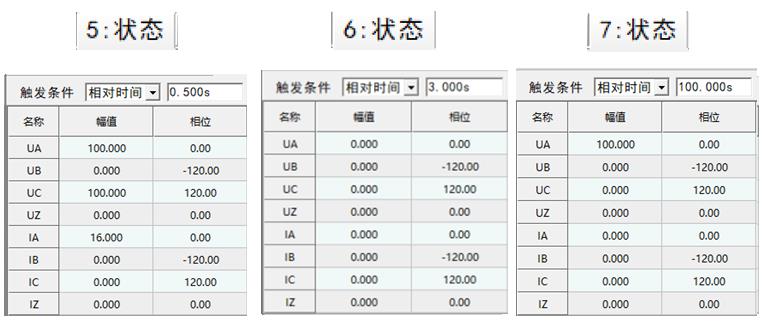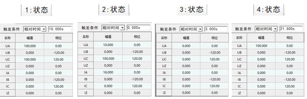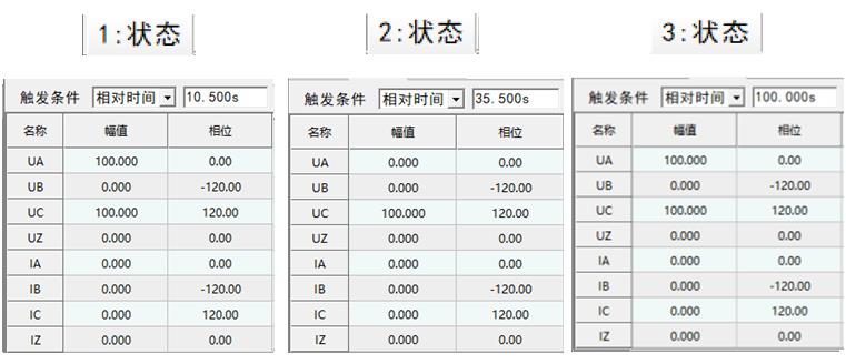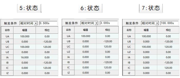 在臺(tái)式機(jī)配電之星軟件FA模塊界面,制定4臺(tái)FTU故障時(shí)狀態(tài)序列進(jìn)行二次模擬量加量,3臺(tái)測(cè)試儀與臺(tái)式機(jī)處在同一局域網(wǎng),對(duì)時(shí)方式使用相對(duì)時(shí)間,在相對(duì)時(shí)間內(nèi)施加故障二次模擬量,觀察線路故障時(shí)的真實(shí)電流電壓變化,同時(shí)查看對(duì)應(yīng)斷路器實(shí)際跳閘情況。