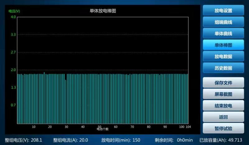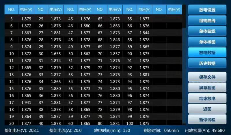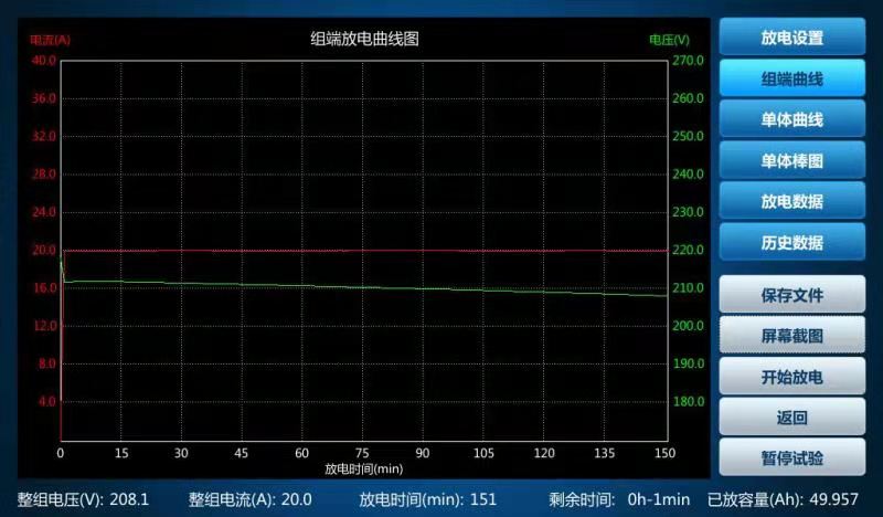 放電結(jié)束后自動(dòng)停止試驗(yàn)即為放電過(guò)程正常。 如出現(xiàn)單體電池低于下限,組端電壓低于下限,試驗(yàn)將自行終止,可根據(jù)現(xiàn)場(chǎng)情況具體處理。 單體電池低于下限,即為電池內(nèi)部損壞,需更換同規(guī)格型號(hào)的電池。 組端電壓過(guò)低,可檢測(cè)充電機(jī)電壓充電時(shí)的電壓,找出落后的蓄電池進(jìn)行替換。