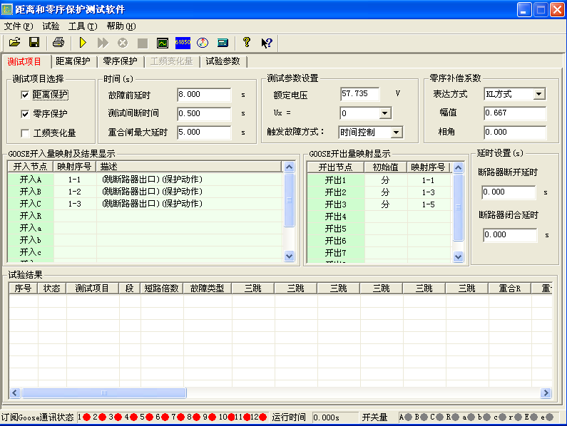 4)設(shè)置的各段“試驗(yàn)時(shí)間”必須大于該段的整定動(dòng)作時(shí)間。 例如: 假設(shè)I段整定動(dòng)作時(shí)間為0s,II段為0.5s,III段為1.0s。 考慮到保護(hù)本身跳閘有一定的固定延時(shí),可以設(shè)I、II、III段的試驗(yàn)時(shí)間分別為0.2s、0.7s、1.2s。 測(cè)試的理想結(jié)果將是: 0.95倍時(shí),本段動(dòng)作; 1.05倍時(shí),本段不動(dòng),下一段時(shí)間不夠不動(dòng)作。 也可以將上述三段的時(shí)間均設(shè)置為大于第三段動(dòng)作時(shí)間。 測(cè)試的理想結(jié)果將是: 0.95倍時(shí),本段動(dòng)作; 1.05倍時(shí),本段不動(dòng),下一段動(dòng)作。