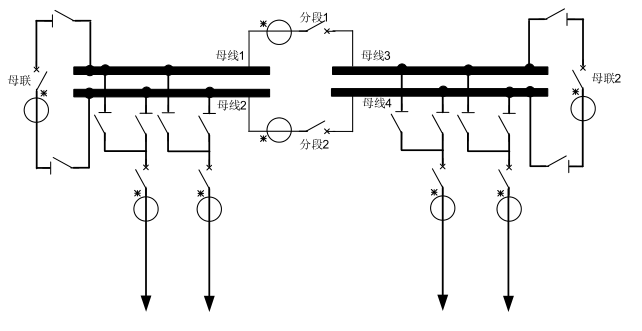雙母雙分段主接線各段母線上除母聯(lián) CT 外,其他所有支路CT極性必須一致,分段1的CT極性與母線1上其他支路 CT 極性保持一致,分段2的 CT 極性與母線2上其他支路CT極性保持一致,雙母雙分段主接線需配置2套母線保護(hù)實(shí)現(xiàn)分段斷路器各側(cè)母線的保護(hù),分段斷路器左側(cè)母線1、母線2采用一套母線保護(hù),分段斷路器右側(cè)母線3、母線4采用一套母線保護(hù)。