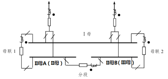 對(duì)于雙母線單分段接線圖中各母聯(lián)CT極性同名端如下圖定義,各支路CT極性同名端在母線側(cè)。
