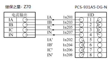 將繼保之星-Z70 手持式繼電保護測試儀的電流輸出端“Ia”、“Ib”、“Ic”分別與保護裝置的交流電流“IA”、“IB”、“IC”(極性端)端子相連;
