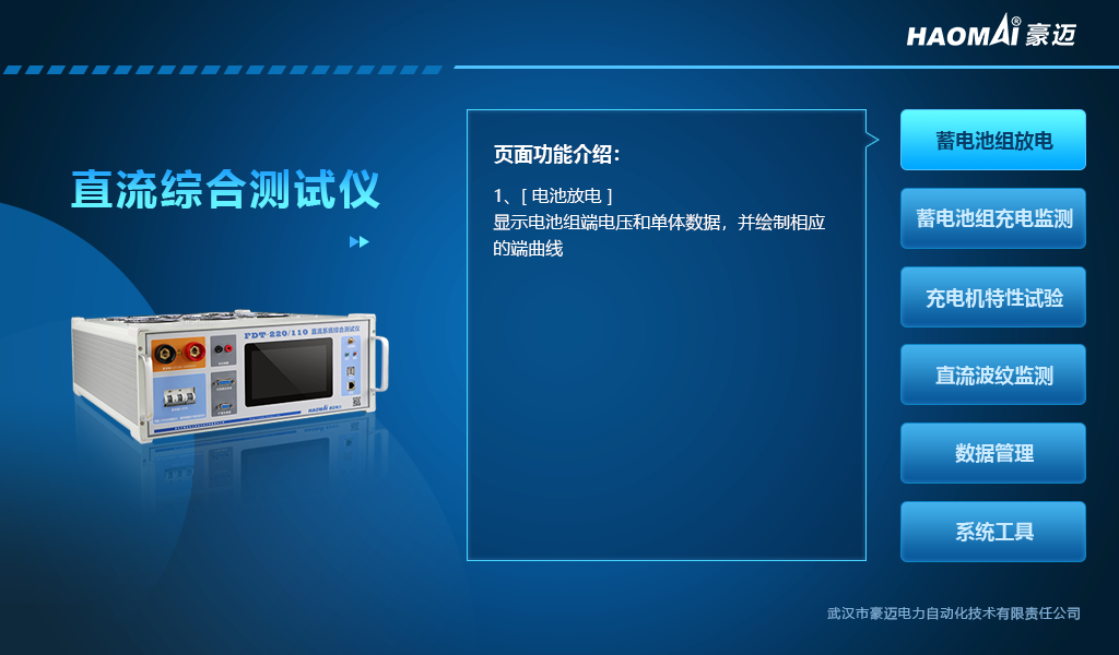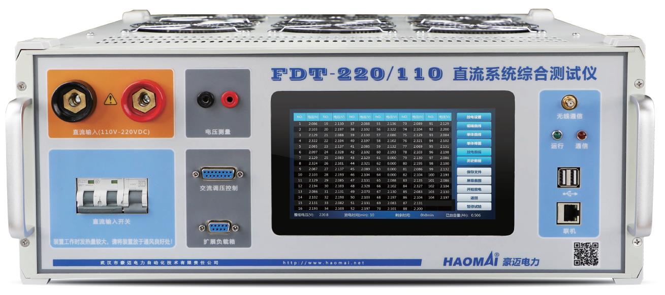 蓄電池組是變電站直流系統(tǒng)的核心,用以保證變電站在交流失電的情況下各種直流負(fù)荷及事故照明的供電。 按照規(guī)程定期對蓄電池組開展放電容量測試是準(zhǔn)確驗(yàn)證蓄電池組性能的有效方式。 武漢豪邁電力FDT-220/110 直流系統(tǒng)綜合測試儀集蓄電池組放電、充電機(jī)紋波系數(shù)、穩(wěn)壓穩(wěn)流精度特性測試于一體,可自動(dòng)連續(xù)調(diào)控放電電流,實(shí)現(xiàn)定電流恒流放電。