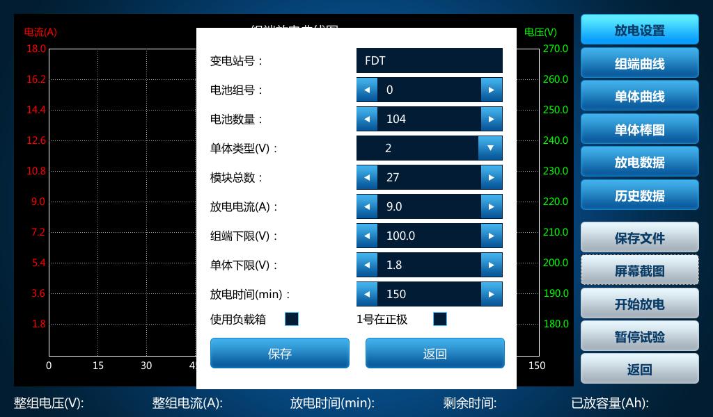 在設(shè)置放電試驗(yàn)和充電機(jī)特性試驗(yàn)時(shí)若保存失敗,請關(guān)閉之前暫停的試驗(yàn)后再設(shè)置。