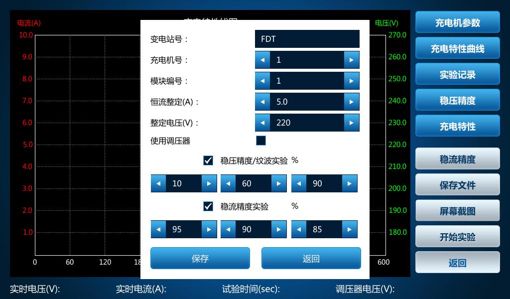 3)充電機(jī)特性試驗(yàn): 設(shè)置充電參數(shù)時(shí)若要使用調(diào)壓器則勾選,選擇對應(yīng)的穩(wěn)壓精度、充電特性、穩(wěn)流精度進(jìn)行試驗(yàn)。