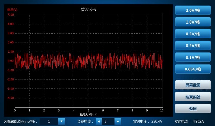 4)直流紋波檢測試驗(yàn): 進(jìn)入試驗(yàn)開始界面,點(diǎn)擊“開始試驗(yàn)”即可觀察當(dāng)前充電機(jī)直流電壓紋波波形圖。