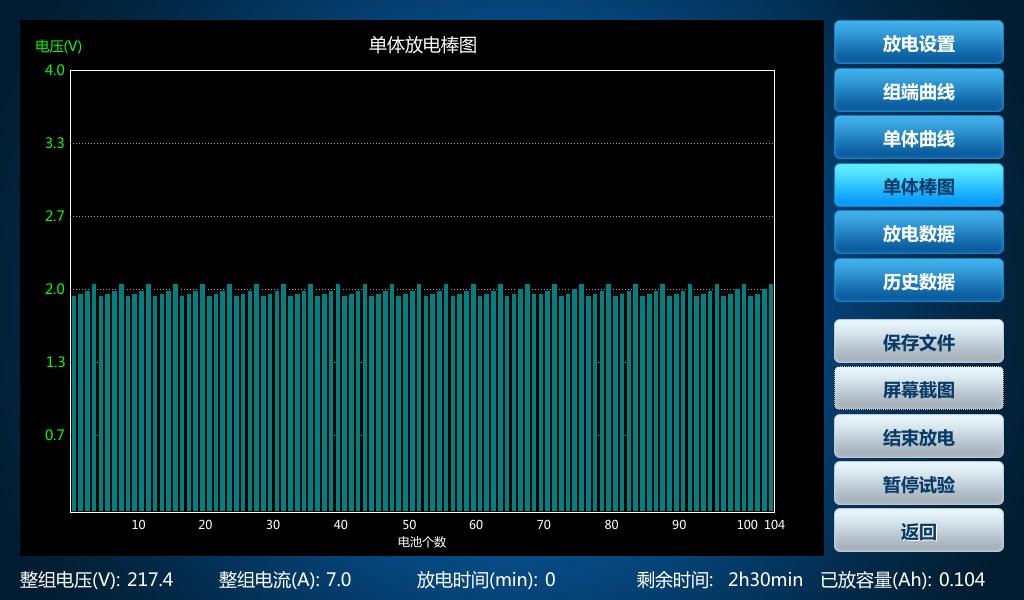 根據(jù)上述操作進(jìn)行試驗(yàn),試驗(yàn)結(jié)束后空開會(huì)自動(dòng)關(guān)閉,若在放電試驗(yàn)中途空開斷開,可能是因?yàn)殡姵貑误w電壓或組端電壓達(dá)到了設(shè)置電壓的下限,同時(shí)屏幕上會(huì)彈出跳空開原因。 如果單體下限中斷試驗(yàn),會(huì)顯示電壓過低單體電池,方便快速找出容量小的電池。