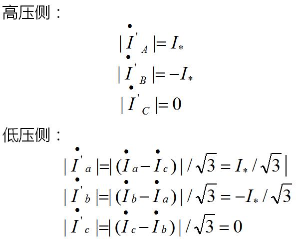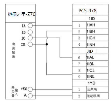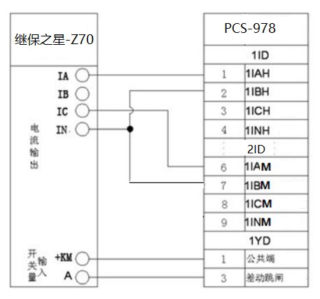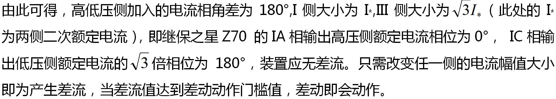 即B、C兩相都會受到影響。 為避免受此影響,使得檢驗更容易進行,高中壓側(cè)采用的接線方式為,電流經(jīng)繼保之星Z70 的IA相,從高壓側(cè)A相流入B相流出。
