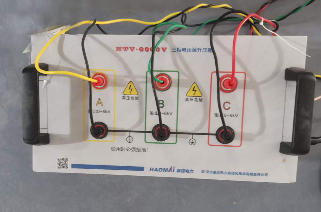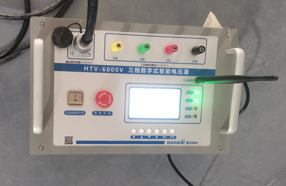 將電流源上的三相電流線接到CT一次側(cè)的進(jìn)線側(cè),黑色的接到出線側(cè)(反向后的輸出值顯示為反極性的值),將無線遙控的電流測試線夾到要測試的二次繞組之間(在保護(hù)裝置上也可讀取二次值),注意繞組電流的流向,測量線的指向應(yīng)與其相同,并且二次測試線應(yīng)插入遙控對應(yīng)相的入口,電壓源與升壓箱之間用航插電纜連接,然后將電壓線與PT的一次側(cè)連接,注意進(jìn)出線的方向,將PT二次側(cè)與遙控相連,插入對應(yīng)的電壓測量口內(nèi)即可進(jìn)行電壓二次測量,也可在保護(hù)裝置上讀取。