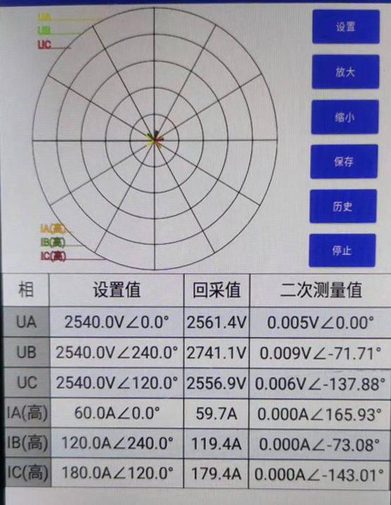 HTA-33 00 、HTV-6000正常運(yùn)行后,A、B、C三相分別加60A、120A、180A的電流,根據(jù)保護(hù)裝置主界面查看PT、CT二次側(cè)采到的二次值幅值與相位,可以看出三相對應(yīng),PT的變比為220: