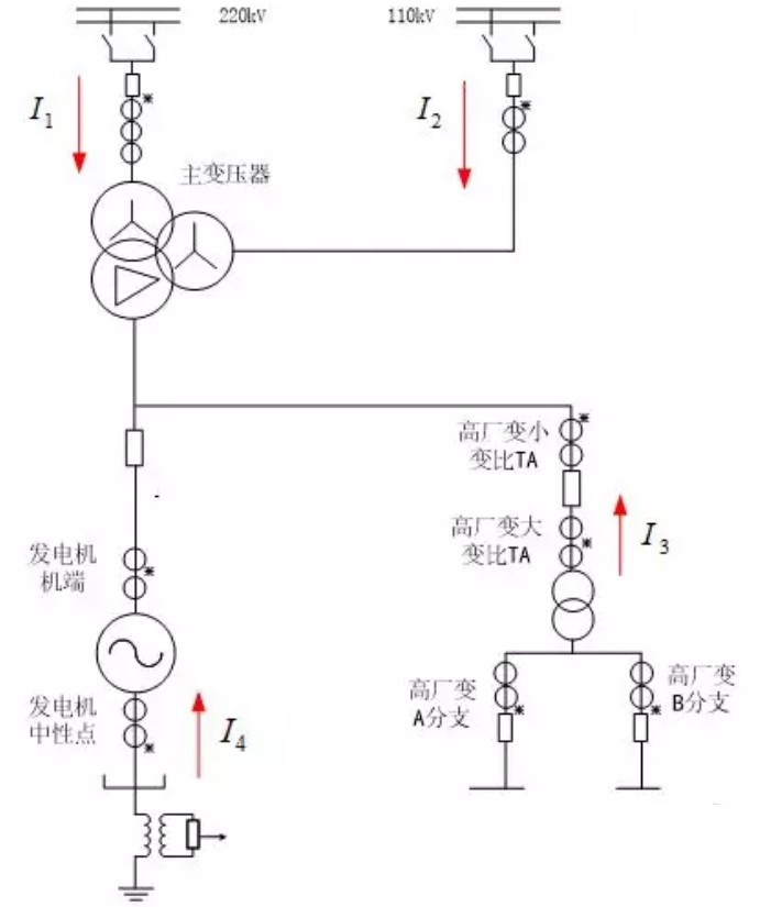 某電廠發(fā)變組系統(tǒng),主變?yōu)槿ψ?,廠變低壓側(cè)為雙分支,發(fā)變組差動(dòng)包含四個(gè)支路電流,分別為主變220kV側(cè)I1,110kV側(cè)I2,高廠變高壓側(cè)I3,發(fā)電機(jī)中性點(diǎn)側(cè)I4。