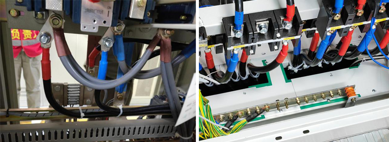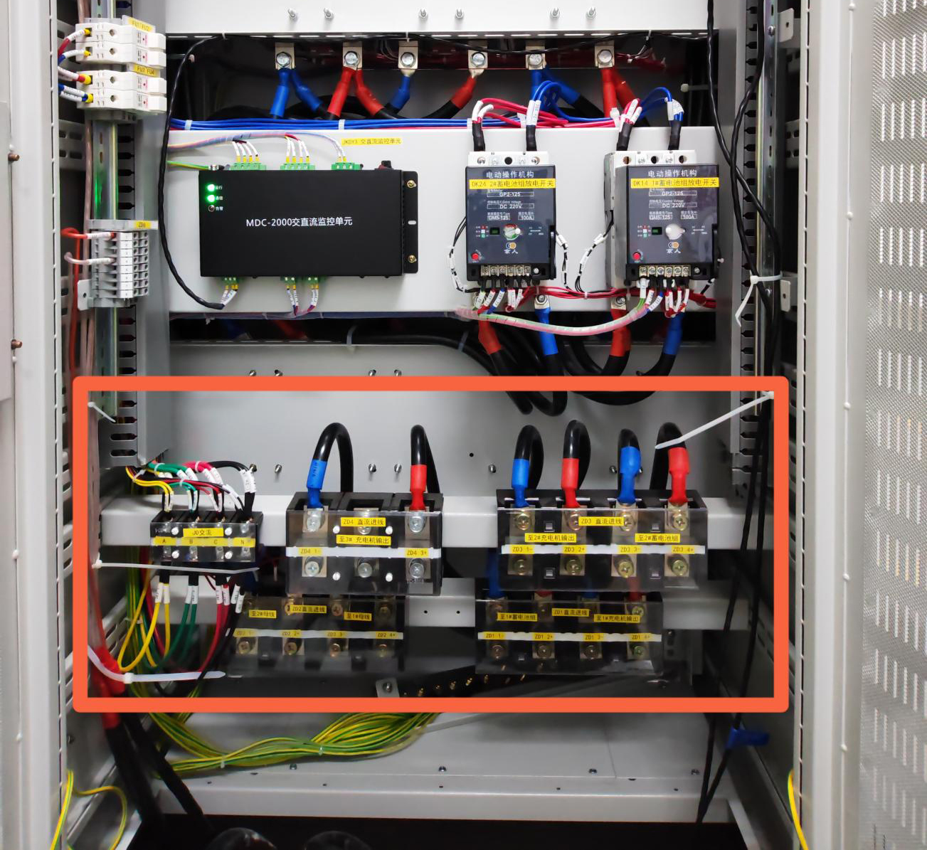 屏柜電纜接線 : 裝置內(nèi)部接線電纜包含: #1、#2、#3號充電機,#1、#2號蓄電池組,#1、#2號母線共計14根動力電纜,一根至饋電屏交流3相電纜,一根蓄電池室通信電纜以及屏柜直流工作電源和上送至后臺網(wǎng)線。
