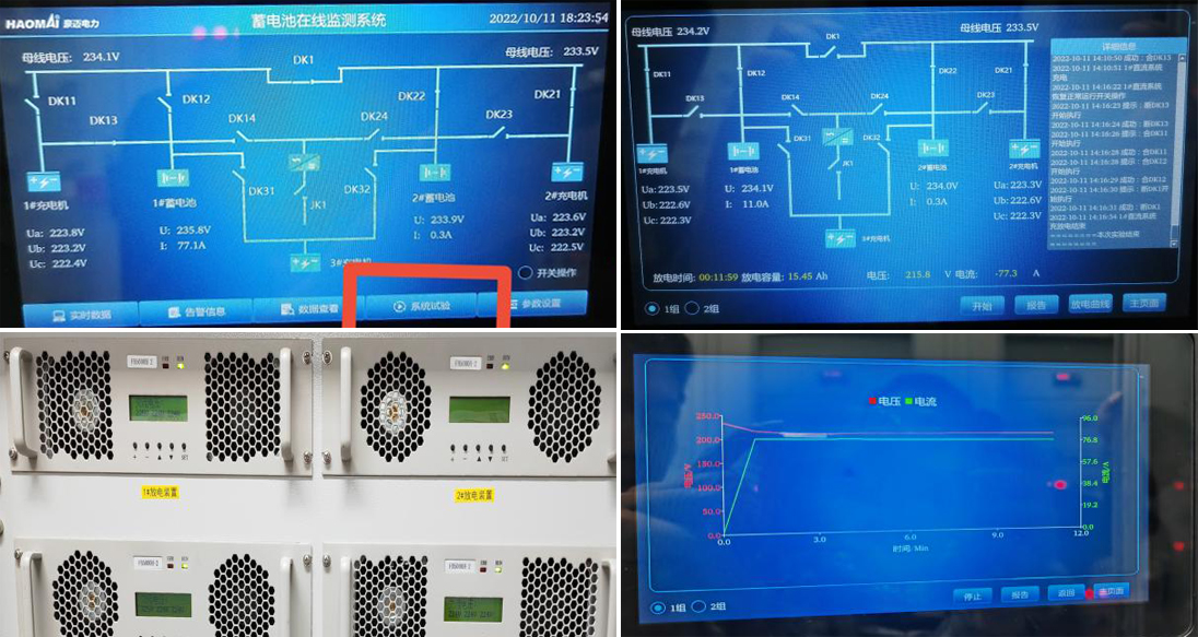 放電試驗時點擊“系統(tǒng)試驗”-“開始”,系統(tǒng)會自動檢測開關(guān)位置和直流系統(tǒng)狀態(tài)量。 試驗時開關(guān)自動操作無須人工干預(yù),有多條開關(guān)操作互鎖邏輯,手動操作開關(guān)時,如果直流系統(tǒng)狀態(tài)不符合操作開關(guān)情況則開關(guān)不動作,確保母線上負(fù)載供電可靠性,避免出現(xiàn)倒閘誤操作情況。