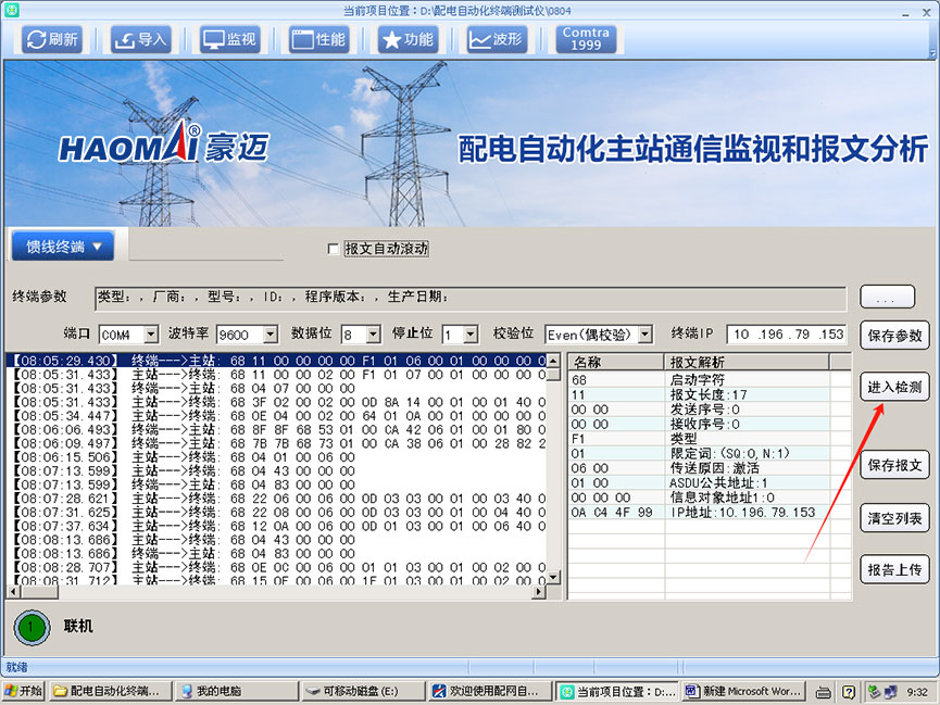 6)開(kāi)始自動(dòng)試驗(yàn)。 確認(rèn)信息無(wú)誤后,回到配網(wǎng)測(cè)試界面,點(diǎn)擊“進(jìn)入檢測(cè)”,開(kāi)始試驗(yàn)。
