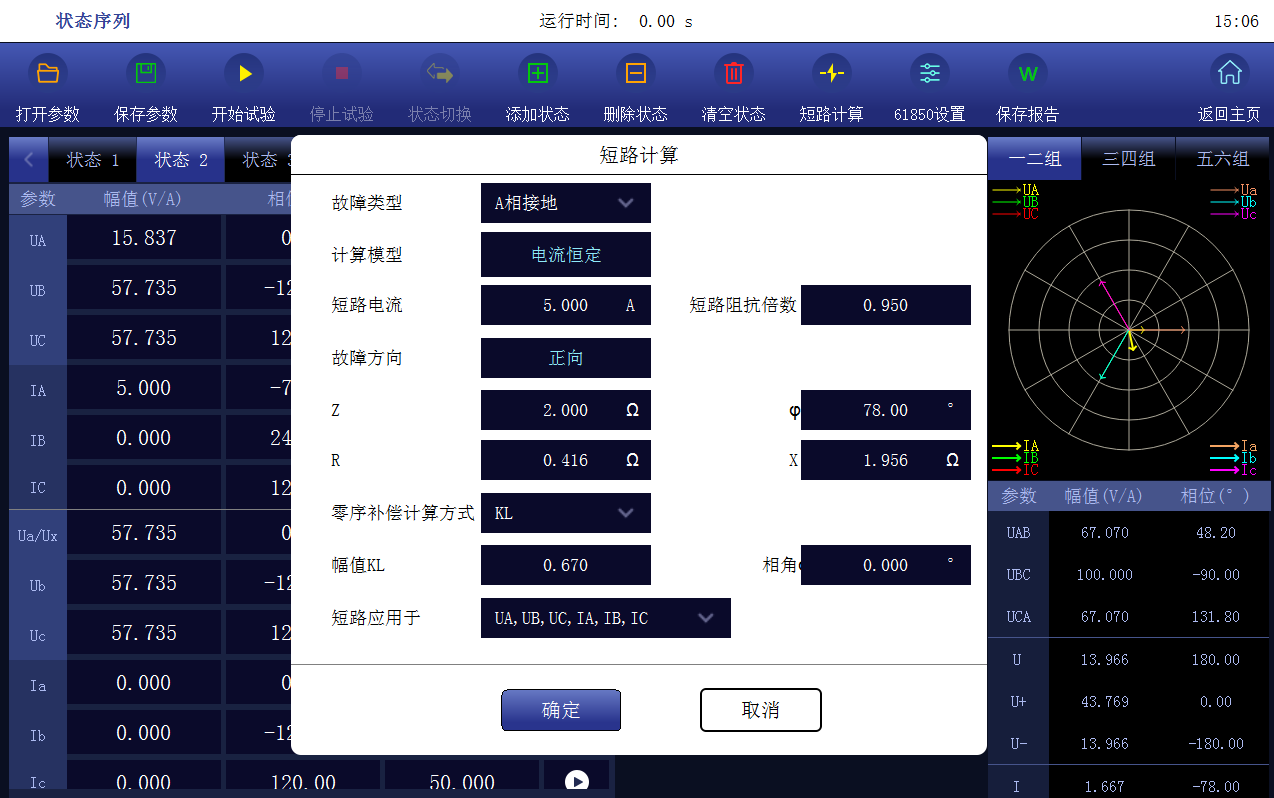 1)模擬A相接路故障,在“狀態(tài)序列”菜單里,通過短路計(jì)算,設(shè)置故障類別,自動(dòng)計(jì)算出故障電流電壓值。