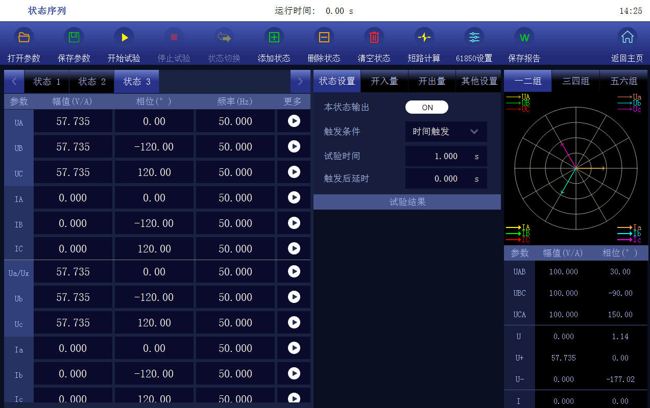 狀態(tài)3設(shè)置: UA=UB=UC=57.734V,IA=IB=IC=0A,電壓電流均為正序,觸發(fā)方式: 時(shí)間觸發(fā)1s。