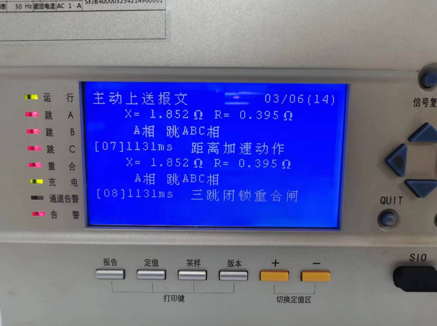 3)試驗(yàn)結(jié)果: 保護(hù)動(dòng)作跳閘信號(hào)燈顯示,先跳A,再重合A,最后再三跳A/B/C。 繼保之星-Z70收到保護(hù)發(fā)出的跳閘信號(hào),測(cè)試儀GOOSE開關(guān)量狀態(tài)2開入量A測(cè)得動(dòng)作時(shí)間為50ms,狀態(tài)3開入量R測(cè)得重合時(shí)間為832ms,狀態(tài)4開入量ABC測(cè)得后加速動(dòng)作時(shí)間37ms。