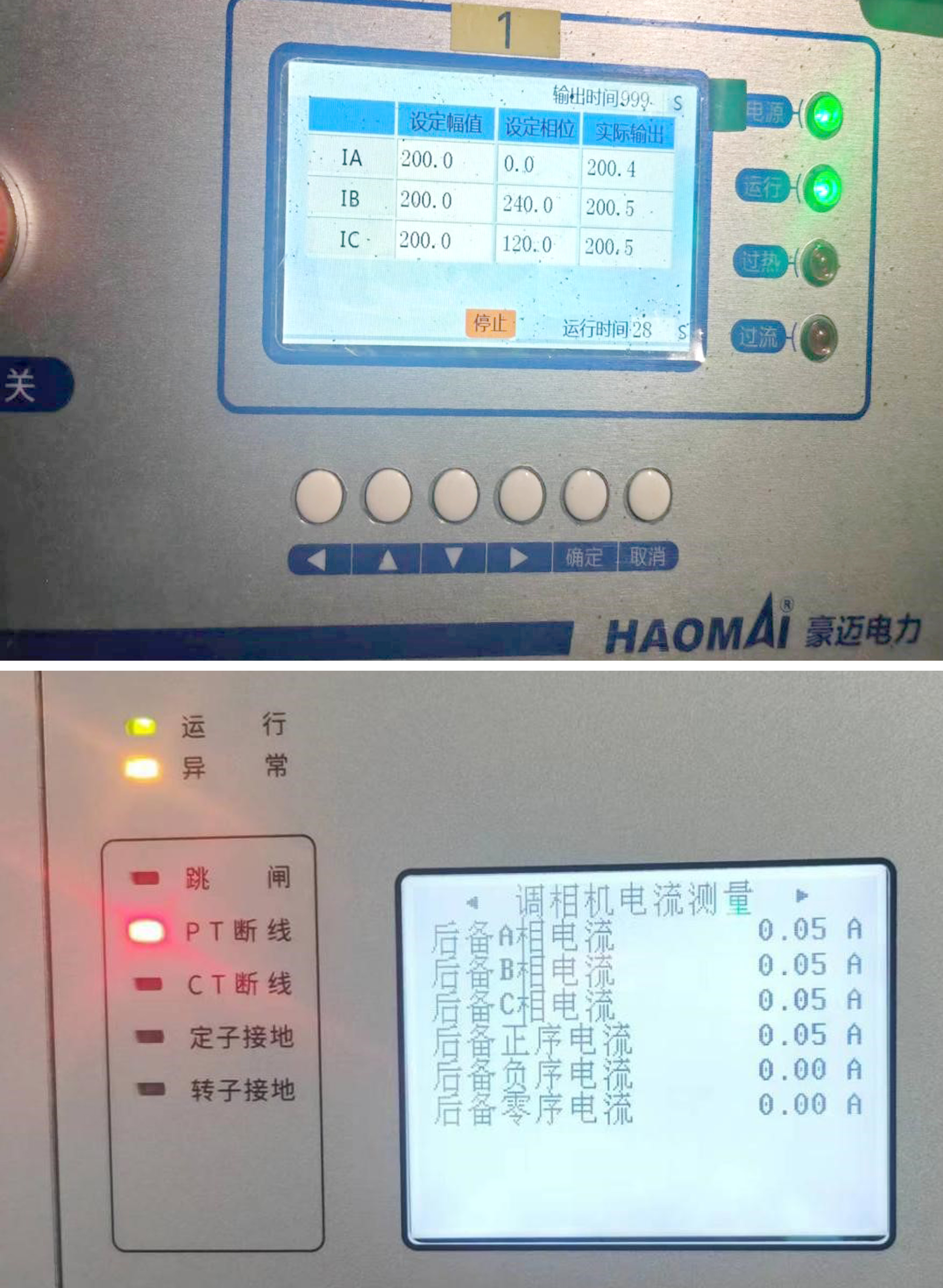 在調(diào)相機(jī)保護(hù)裝置6個(gè)穿芯CT加電流。