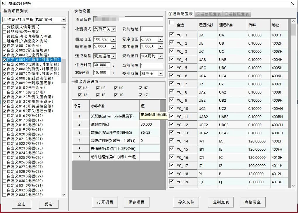 打開“項目管理”配置測試案例、FTU或DTU基本參數(shù)、額定電壓、額定電流、零序電壓、零序電流、保持時間、SOE等待時間、遙測、遙信點表。