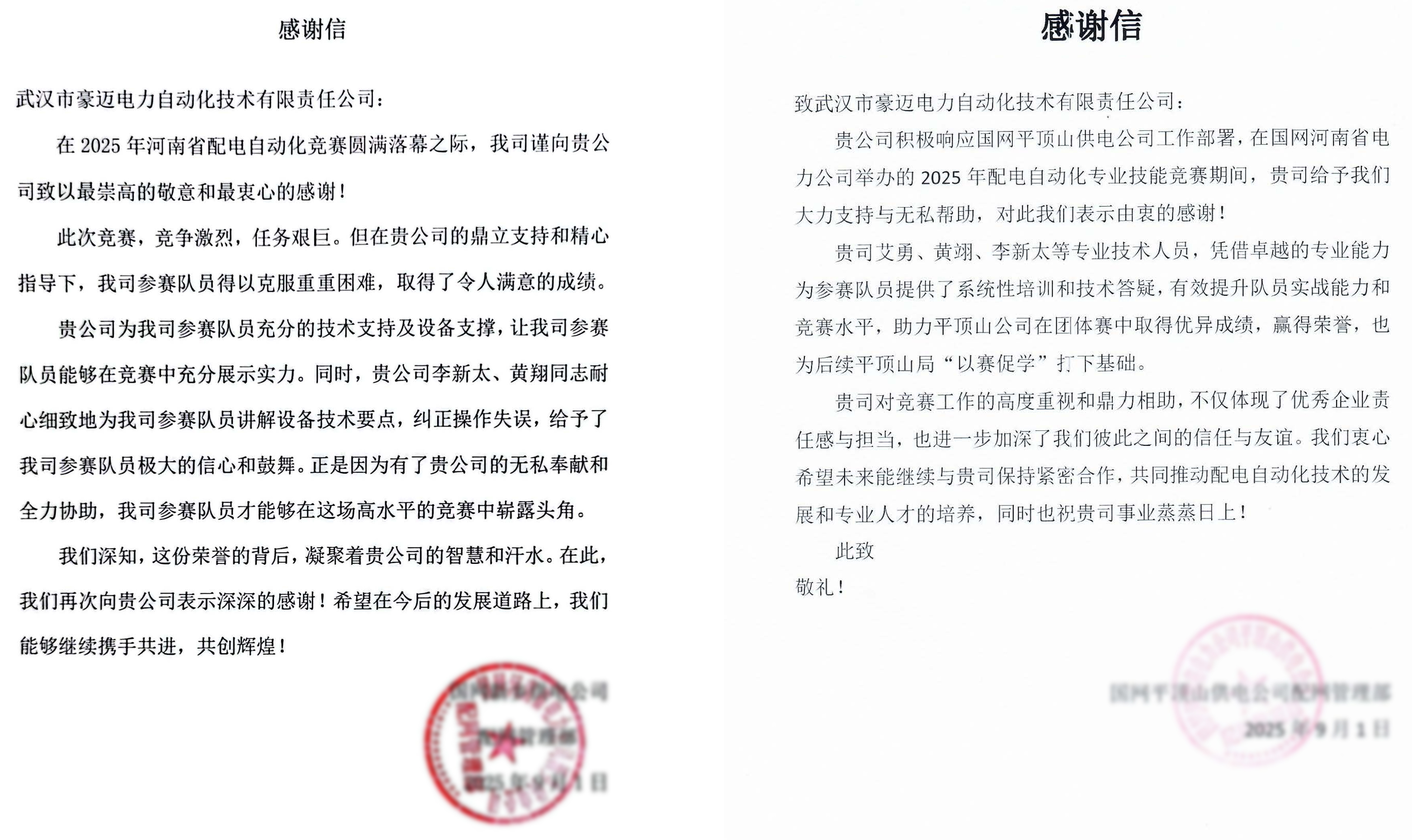 賽后,國(guó)網(wǎng)河南省電力多家供電公司陸續(xù)發(fā)來(lái)感謝信,對(duì)武漢豪邁的技術(shù)服務(wù)表示高度認(rèn)可。信中特別強(qiáng)調(diào),公司提供的設(shè)備支撐和技術(shù)指導(dǎo),為參賽選手提供了優(yōu)質(zhì)的學(xué)習(xí)資源,通過(guò)耐心講解設(shè)備要點(diǎn)、分析糾正操作失誤,顯著提升了選手的實(shí)戰(zhàn)能力,為競(jìng)賽取得優(yōu)異成績(jī)提供了有力保障。武漢豪邁對(duì)此深表感謝,并將繼續(xù)以優(yōu)質(zhì)的產(chǎn)品和服務(wù)回報(bào)用戶的信任與支持。