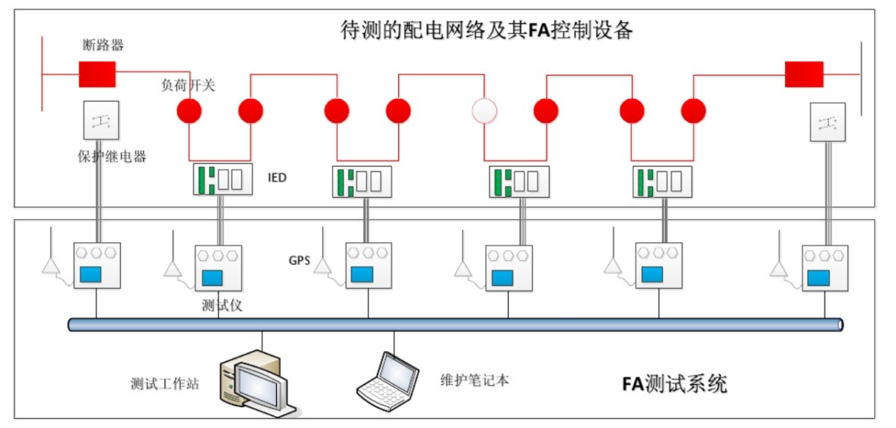 不停電狀態(tài)下,實現(xiàn)多點DTU/FTU/TTU終端的同步故障模擬,配合主站進行故障區(qū)域判斷、故障隔離和供電恢復(fù)策略執(zhí)行,實現(xiàn)完整的饋線自動化(FA)功能測試;