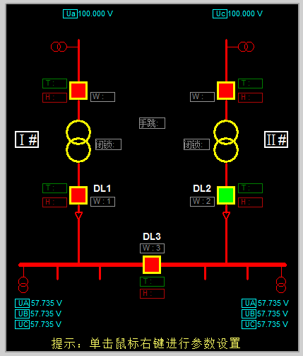 狀態(tài)④: I、II母線正常電壓,進線II備用電源正常電壓,DL1斷路器分,開出1“DL1 TWJ”合位,DL2斷路器合,開出2“DL2 TWJ”分位,DL3斷路器合,開出3“DL3 TWJ”分位,可設置時間觸發(fā)5s,線路恢復正常供電。