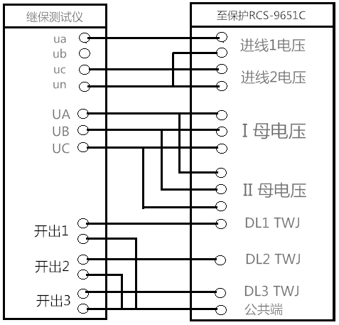 將繼保之星-S60 的電壓輸出端“Ua”、“Ub”、“Uc”、“Un”分別與保護裝置的進線I母電壓,進線II母電壓連接。 繼保之星-S60 的電壓輸出端“UA”、“UB”、“UC”與保護裝置的I母三相電壓、II母三相電壓連接。