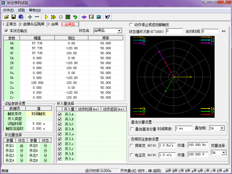 繼保之星-S60 “狀態(tài)序列”狀態(tài)①: I、II母線正常電壓,進線II備用電源正常電壓,DL1斷路器合,開出1“DL1 TWJ”分位,DL2斷路器分,開出2“DL2 TWJ”合位,DL3斷路器合,開出3“DL3 TWJ”分位,設置按鍵觸發(fā),等待充電完成。