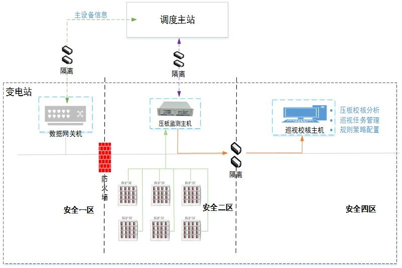安全架構(gòu):嚴(yán)格遵循網(wǎng)絡(luò)安全規(guī)范,壓板監(jiān)測系統(tǒng)部署于I/II區(qū),壓板巡視校核系統(tǒng)部署于IV區(qū),通過單向隔離裝置傳輸數(shù)據(jù)。(支持第三方IEC61850/IEC104接入監(jiān)控/遠(yuǎn)動/保信子站)