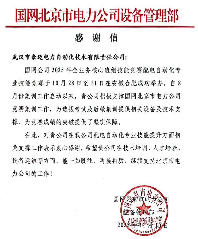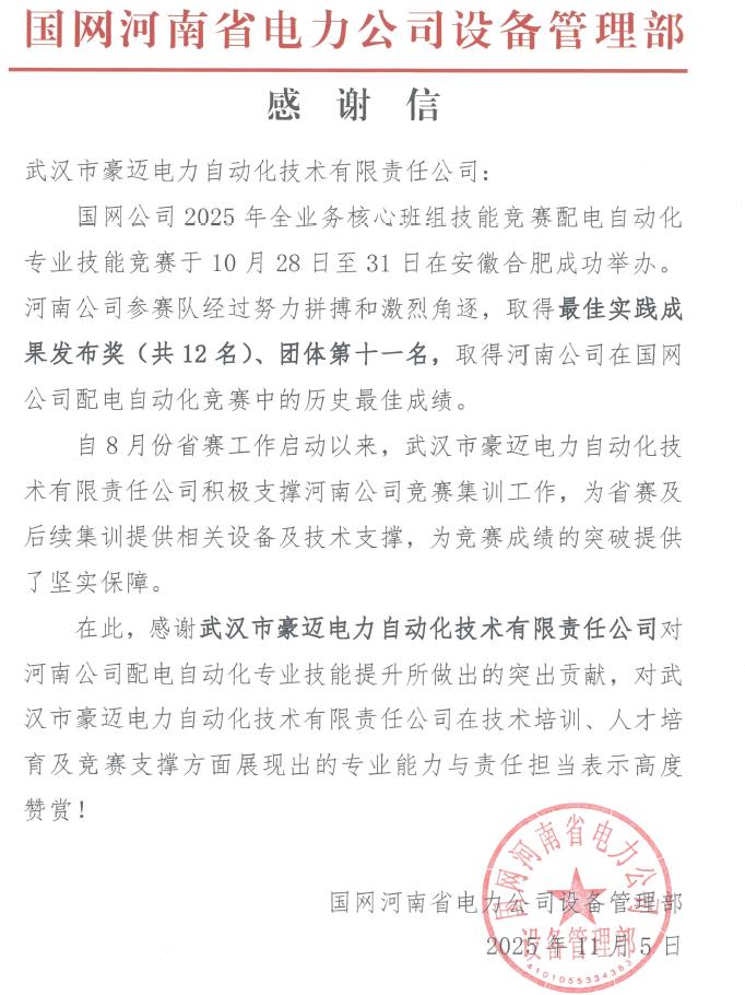 近日,武漢豪邁接連收到國網(wǎng)河南省電力、國網(wǎng)北京市電力發(fā)來的感謝信,信中高度肯定并感謝我司對國網(wǎng)公司2025年全業(yè)務(wù)核心班組技能競賽配電自動化專業(yè)技能競賽集訓(xùn)工作的積極支撐??蛻粼谛胖斜硎荆錆h豪邁為選拔考試及集訓(xùn)提供相關(guān)設(shè)備及技術(shù)支撐,為競賽成績的突破提供了堅實保障,并對公司在技術(shù)培訓(xùn)、人才培育及競賽支撐方面展現(xiàn)出的專業(yè)能力與責(zé)任擔(dān)當(dāng)表示高度贊賞。